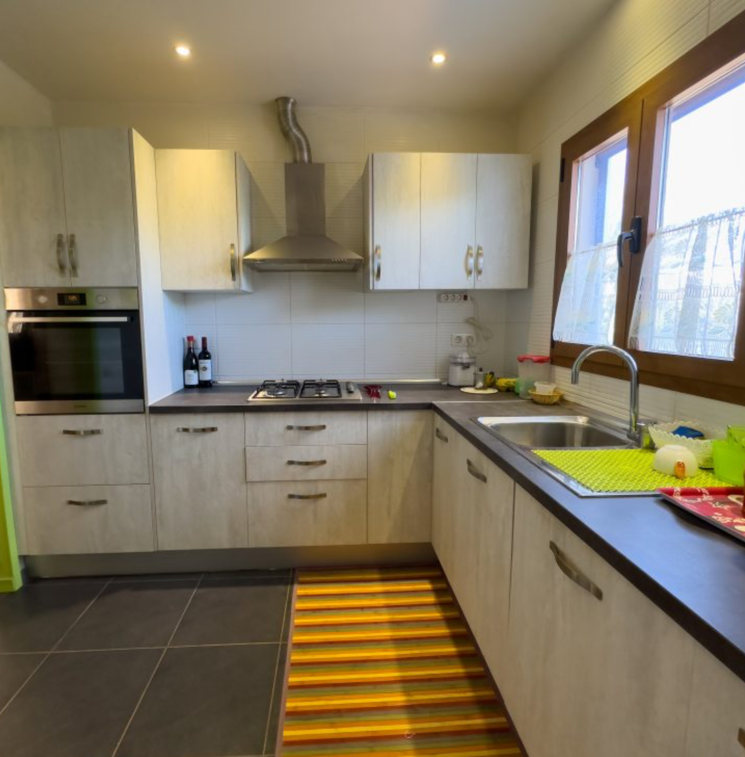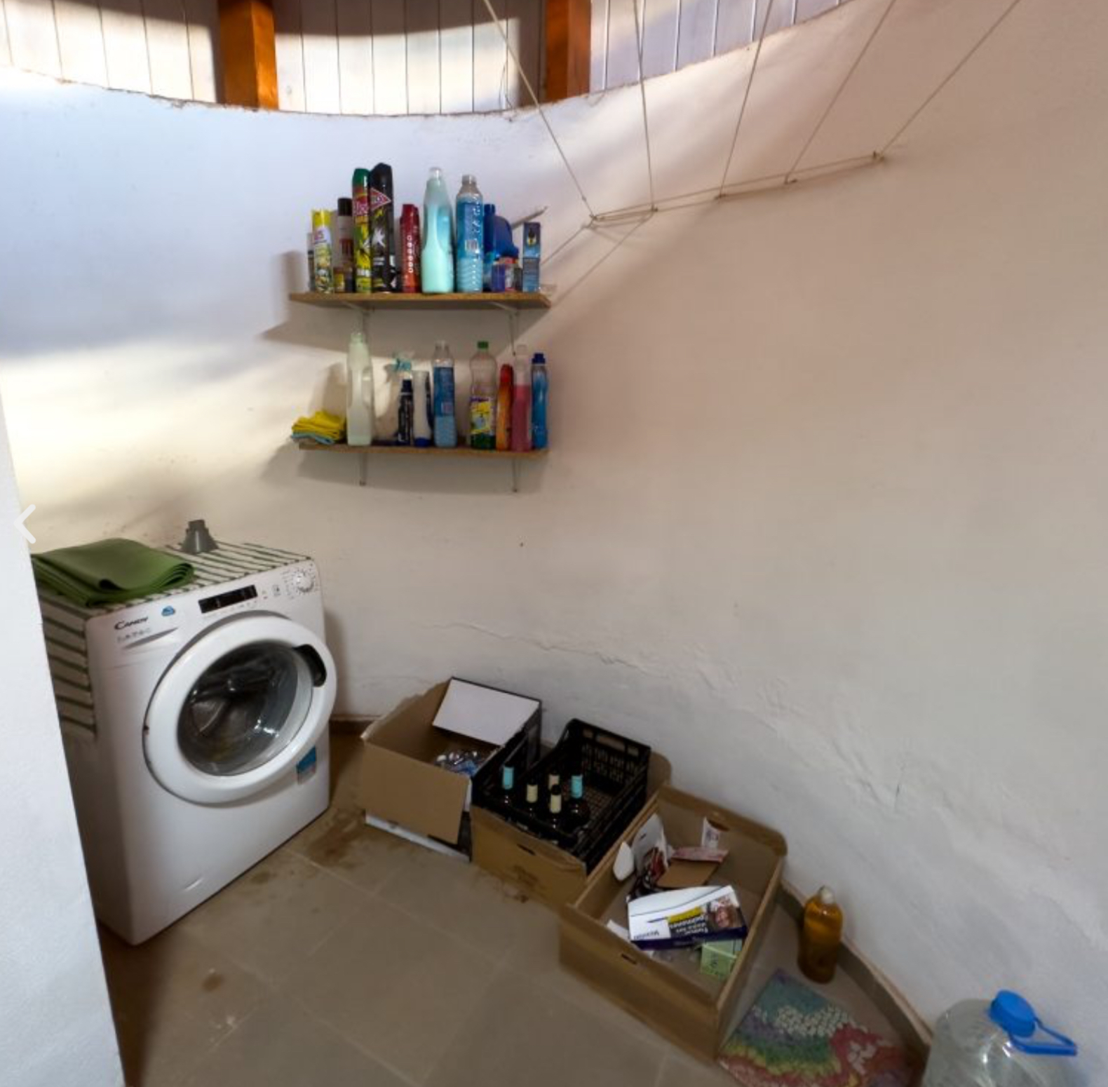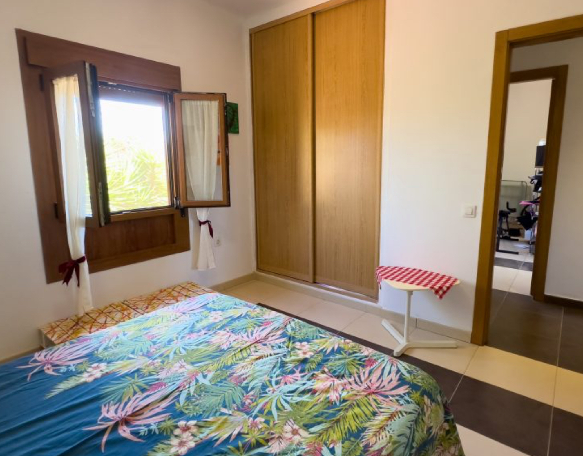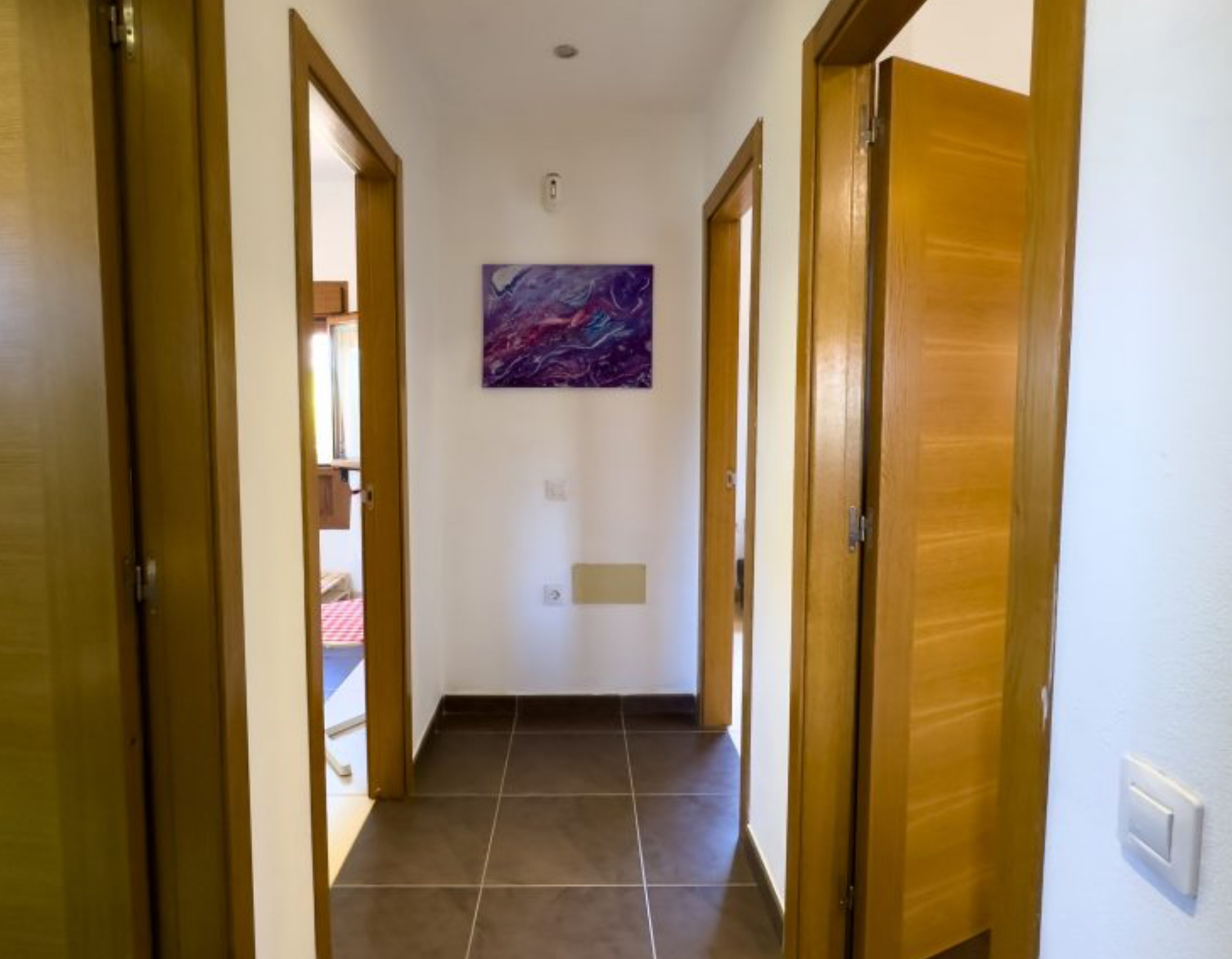 Cercano a la entrada de la casa se encuentra un primer baño completo muy luminoso con plato de ducha en obra. La cocina independiente presenta un estilo moderno y es muy luminosa. El cuarto de lavandería, tiene una zona para tender con posibilidad de usarla como despensa. Desde la cocina se accede al living dividido entre salón de estar y comedor. A continuación hay un primer dormitorio doble con armario empotrado y aire acondicionado, el segundo baño completo de 4 piezas y con plato de ducha en obras. El segundo dormitorio es doble y consta también de armario empotrado. La tercera habitación que se utiliza como sala de hobbies también tiene armario empotrado.