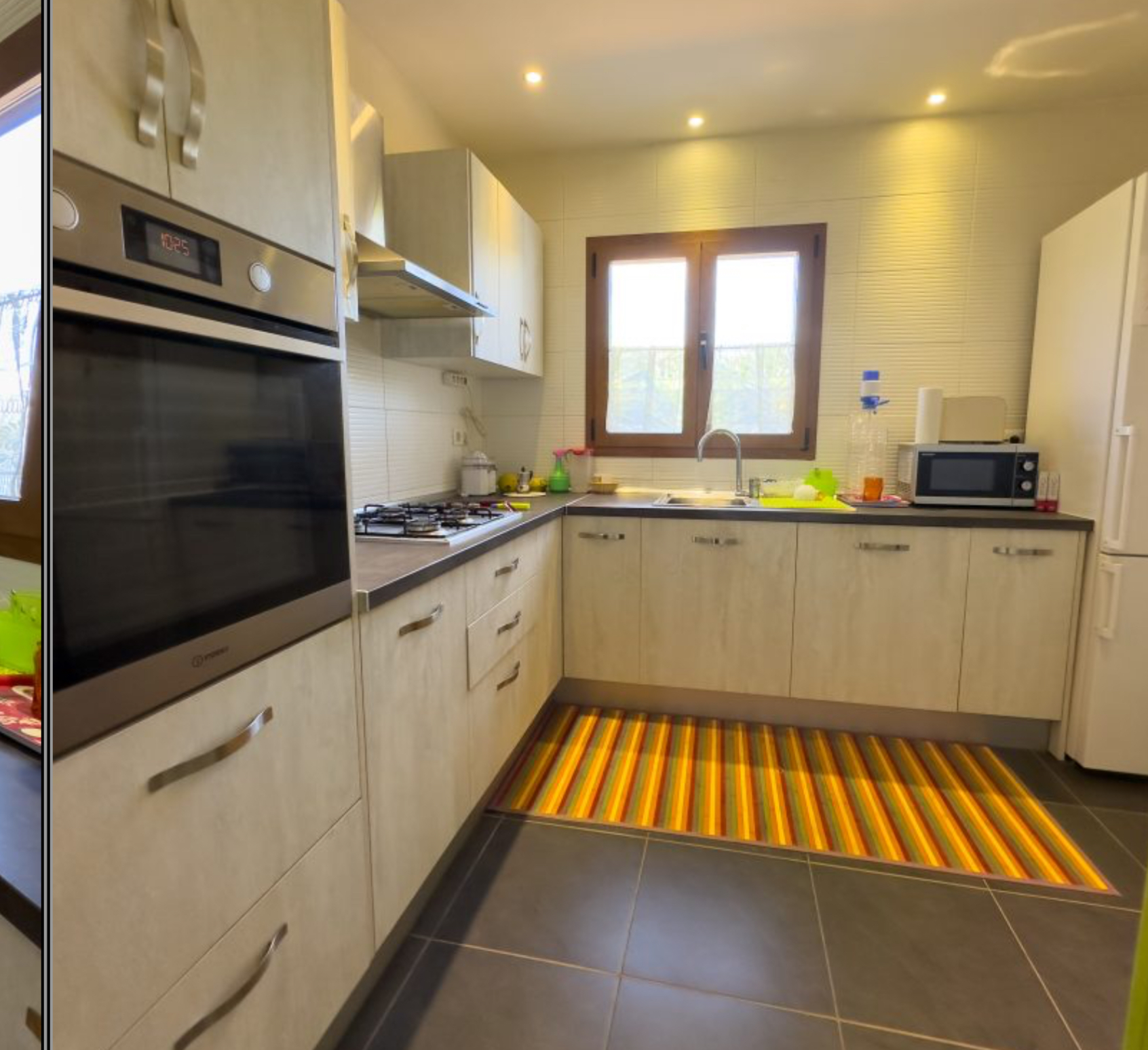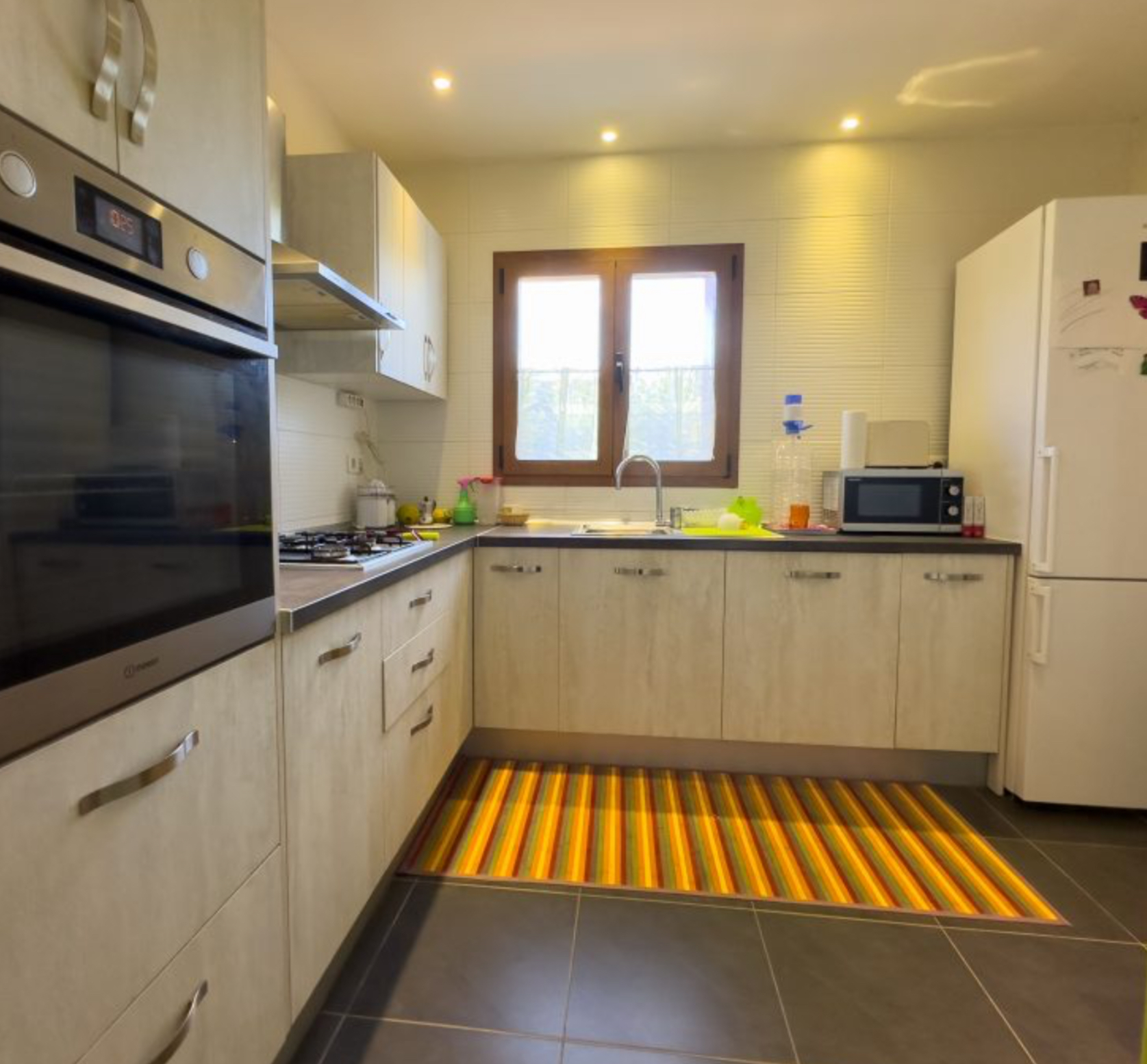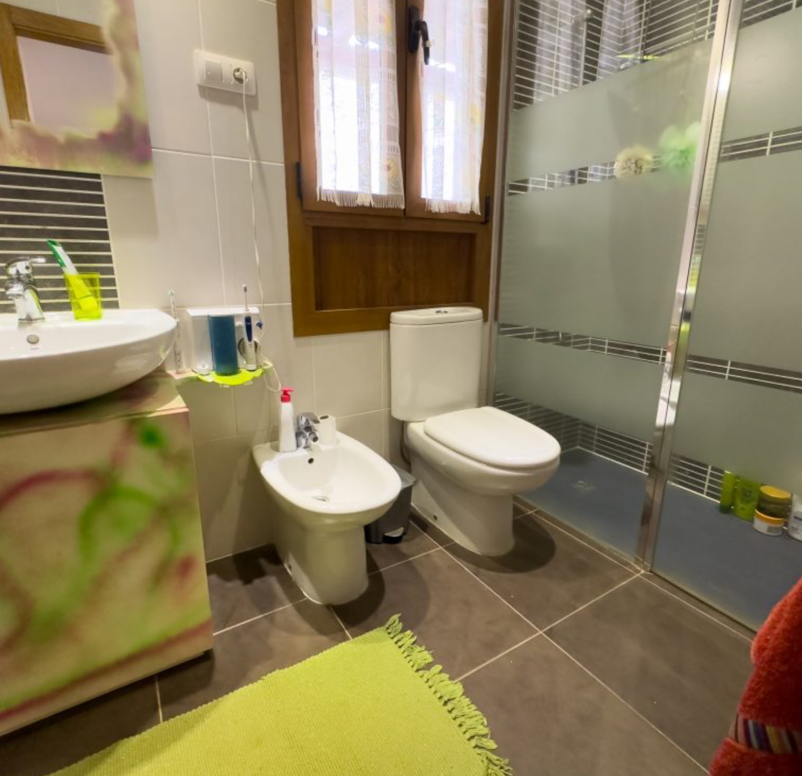 Cercano a la entrada de la casa se encuentra un primer baño completo muy luminoso con plato de ducha en obra. La cocina independiente presenta un estilo moderno y es muy luminosa. El cuarto de lavandería, tiene una zona para tender con posibilidad de usarla como despensa. Desde la cocina se accede al living dividido entre salón de estar y comedor. A continuación hay un primer dormitorio doble con armario empotrado y aire acondicionado, el segundo baño completo de 4 piezas y con plato de ducha en obras. El segundo dormitorio es doble y consta también de armario empotrado. La tercera habitación que se utiliza como sala de hobbies también tiene armario empotrado.