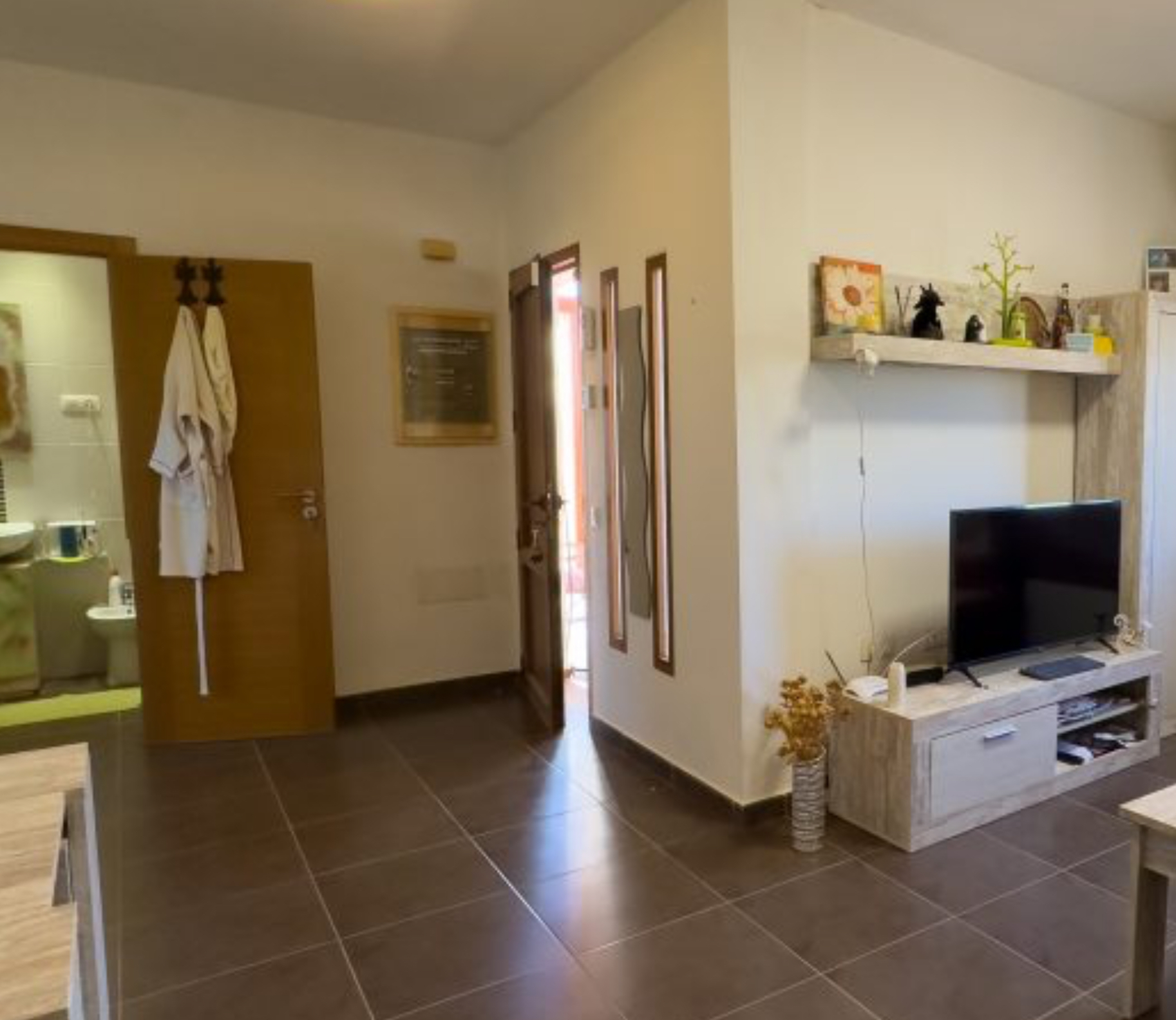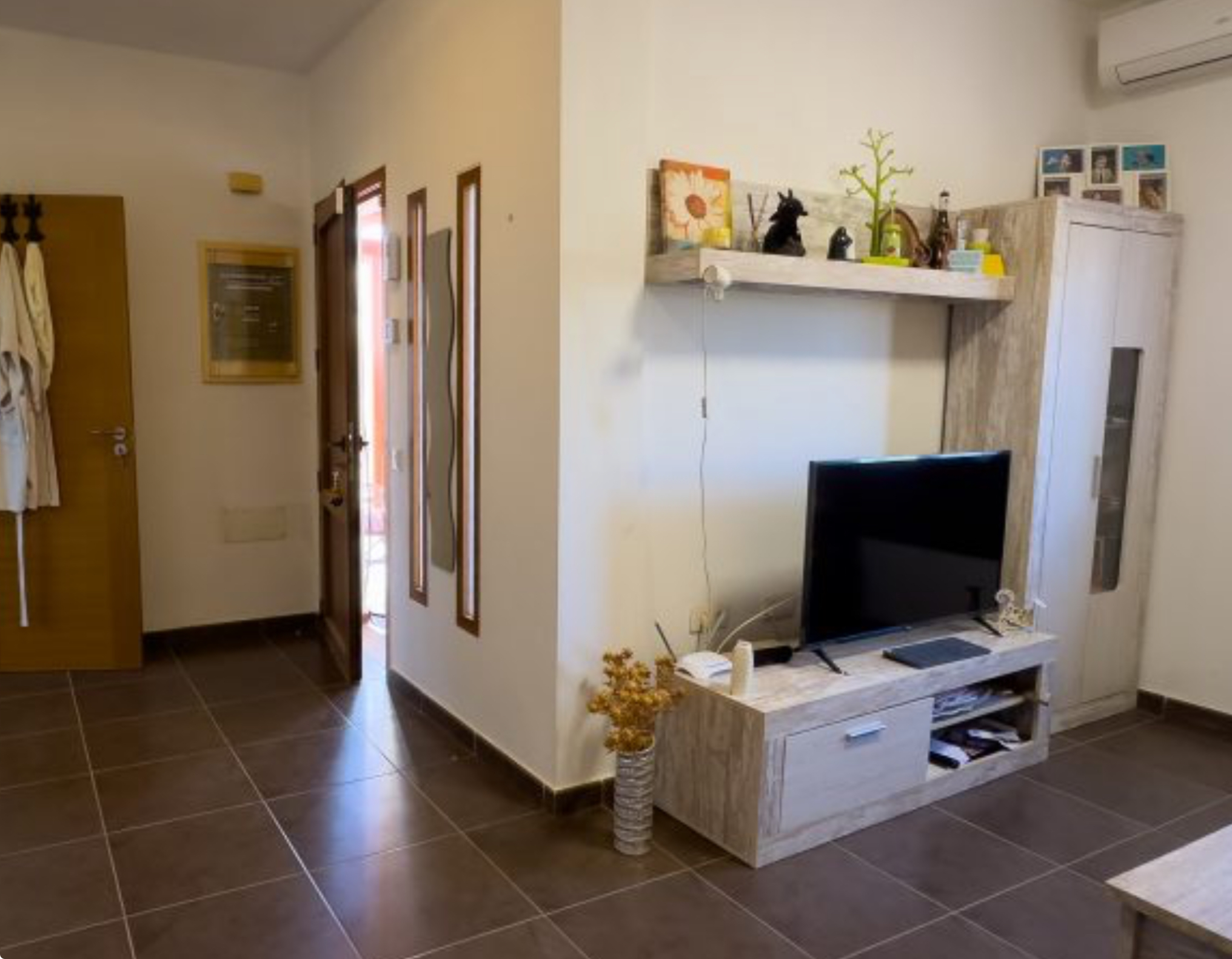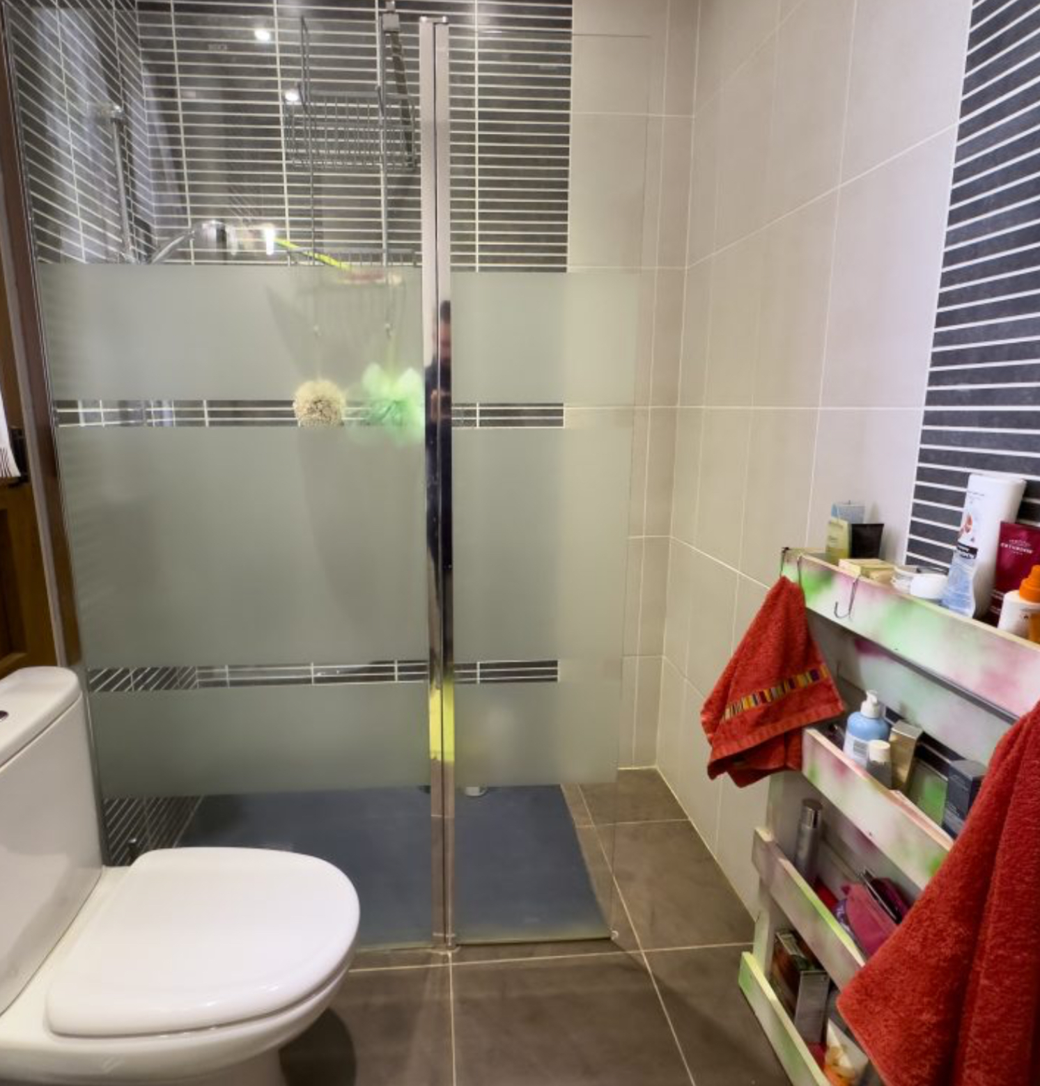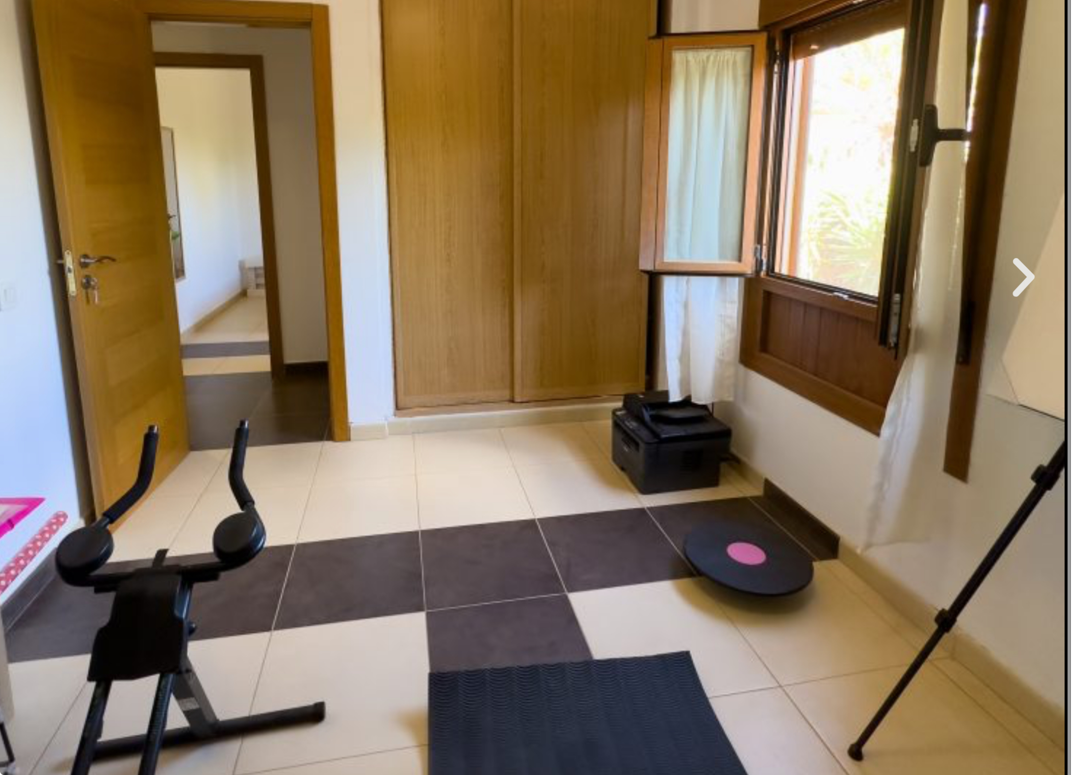 Cercano a la entrada de la casa se encuentra un primer baño completo muy luminoso con plato de ducha en obra. La cocina independiente presenta un estilo moderno y es muy luminosa. El cuarto de lavandería, tiene una zona para tender con posibilidad de usarla como despensa. Desde la cocina se accede al living dividido entre salón de estar y comedor. A continuación hay un primer dormitorio doble con armario empotrado y aire acondicionado, el segundo baño completo de 4 piezas y con plato de ducha en obras. El segundo dormitorio es doble y consta también de armario empotrado. La tercera habitación que se utiliza como sala de hobbies también tiene armario empotrado.
